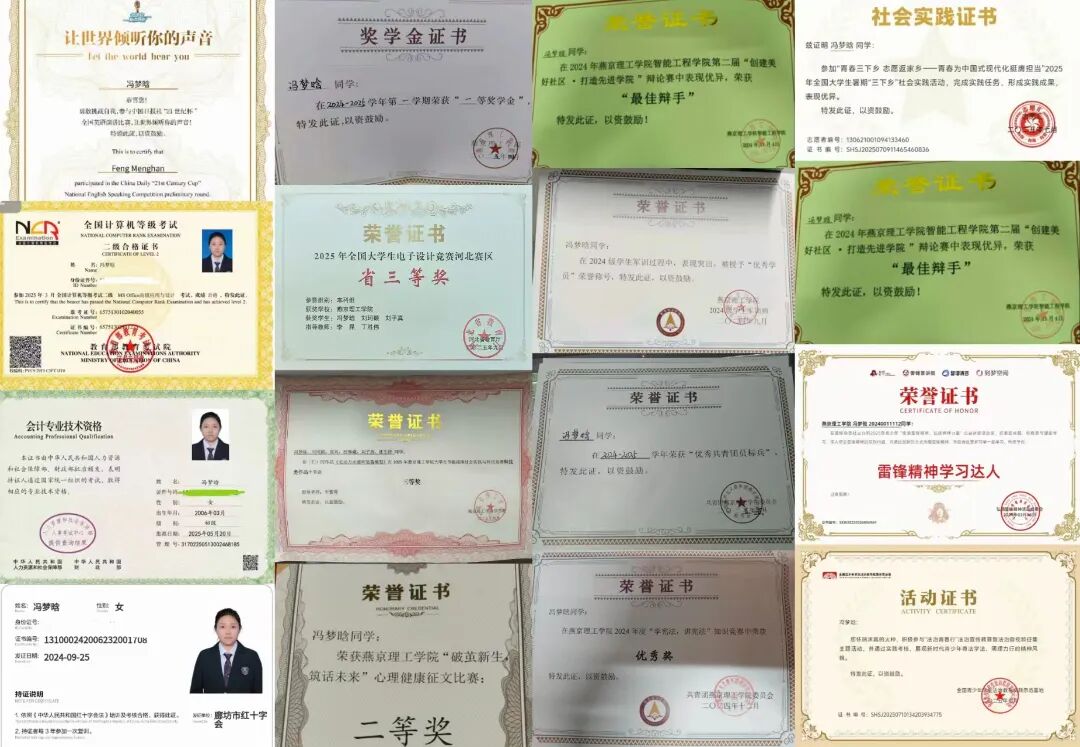 努力赋能青春 智能榜样成长(五) | 国奖风采录:冯梦晗 冯梦晗,智能工程学院自控2404班班长、红十字会部长,始终以“以笃立心,以新筑梦”为准则,追求全方位发展,在多领域展现青年担当。 坚信思想高度决定成长广度。入学初便主动向党组织靠拢,认真学习党的理论、关注时事,凭借积极表现成为班级大一第一批入党积极分子,筑牢理想信念。 积极学习优秀榜样,践行雷锋精神。在2025年青少年“传承雷锋精神,弘扬榜样力量”公益讲座中,既沉浸式领悟精神,又创新通过分享会、短视频带动同学学习,获评“雷锋精神学习达人”。同时,她还将思想觉悟转化为行动,投身“法治养行”宣传、“青春三下乡”等公益活动,累计志愿时长206小时,到梦空间积分70+,用行动传递青年温度。 作为学生,她始终以“精益求精”态度深耕专业,将学业放在核心位置。大一学年,连续两学期综合成绩班级第1,绩点4.12,获2024-2025学年第一学期“一等奖学金”。这份成绩源于课上紧跟思路、课后勤于复盘的坚持,以及对专业知识的热爱。她还主动拓展能力:通过全国计算机等级考试二级MS Office,取得会计专业技术资格初级证书,夯实跨领域应用基础;参与2025“外研社·国才杯”“理解当代中国”外语能力公开赛英语组赛事,获校级优秀奖,在语言实践中锤炼国际视野与表达能力,为实践创新筑牢根基。 深耕专业的同时,保持创新热情,投身学科竞赛与科研实践,累计获国家级奖项3项、省市级3项、校级8项、院级10余项。在全国大学生电子设计大赛(河北赛区)中,与团队突破电路设计、程序调试瓶颈,获省级三等奖;参与全国大学生节能减排大赛,设计的《无动力水循环装置模型》获校级三等奖。 校园活动中她亦勇于担当。作为自控2404班班长,牵头制定“学习互助小组+定期复盘会”方案;作为红十字会部长,组织急救培训、绿色回收等活动,助力校园公益。此外,还获学院辩论赛“最佳辩手”、“破茧新生,筑话未来”心理健康征文比赛校级二等奖、“学宪法,讲宪法”知识竞赛校级优秀奖,在多元实践中提升素养。 热爱体育运动,以羽毛球、乒乓球为日常活力“充电站”,积极参与校园赛事。在学校篮球赛中为团队助威,在羽毛球、乒乓球比赛中享受竞技乐趣,还踊跃报名校园运动会多个项目。同时,参与“一·二九”接力长跑比赛,凭借团队协作与耐力斩获季军,展现燕理学子青春活力。 “服务他人,成就自我”是她参与志愿活动的初心。大一学年,累计组织志愿活动10余次,服务超500人:在“千人进社区”中带队开展敬老、反诈宣讲;作为迎新志愿者,帮新生搬运行李、解答疑问;牵头考前辅导,为同学梳理知识、分享复习方法,传递班级温暖。 这些经历让她收获多方认可:2024级军训获“优秀学员”、2024-2025学年荣获“优秀共青团员标兵”。参与全国大型数字公益活动“AI在校园益启青春”时,用AI制作公益科普视频获荣誉证书;在“大学生网络文化节”中,参与创作的《急救你也可以是守护者》获影像创意汇赛道一等奖,延伸志愿服务价值。 从书桌钻研到赛场拼搏,再到社区服务,始终以“以笃立心,以新筑梦”为准则。未来,将继续深耕自动化专业,参与实训提升应用能力,努力从燕理“追梦者”成长为助力国家发展的“实干者”,在更广阔舞台绽放青春。