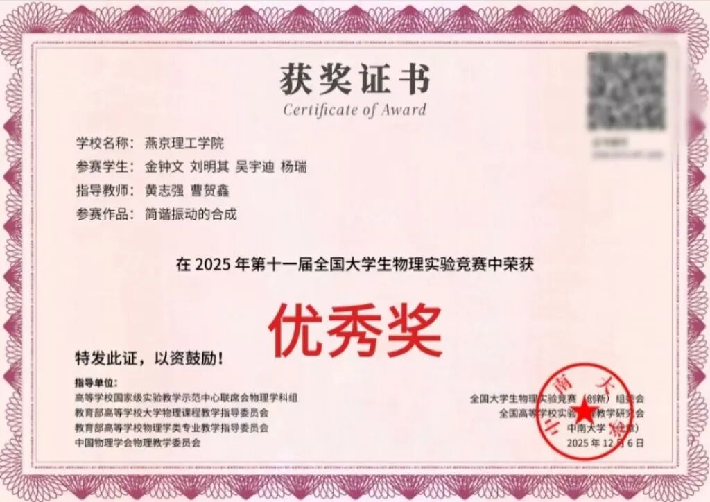 燕京理工学院学子在第十一届全国大学生物理实验竞赛中斩获佳绩 近日,2025 年第十一届全国大学生物理实验竞赛圆满落幕,燕京理工学院学子凭借扎实的专业功底与创新实践能力,在这场全国性高水平赛事中表现亮眼,共斩获1项三等奖,2项优秀奖、展现了学校在物理实验教学与学生创新能力培养方面的卓越成果。 在本次竞赛中,由韩菲、黄志强老师指导,宋静雯、邱健辉、刘芮尧同学组成的团队,凭借《迈克尔逊干涉实验》荣获三等奖;由黄志强、曹贺鑫老师指导,金钟文、刘明其、吴宇迪、杨瑞同学组成的团队,凭借作品《简谐振动的合成》荣获优秀奖;由魏环、魏鹏冲老师指导,郑炳基、王佳琪、常晋同学组成的团队,以作品《霍尔效应》同样斩获优秀奖。 获奖成绩的取得,离不开学校对学科竞赛的高度重视与大力支持,也凝聚着指导教师的悉心指导和参赛学生的不懈努力。参赛团队在备赛期间,深入钻研实验原理、反复打磨设计方案、不断优化实验操作,将理论知识与实践创新深度融合,最终在竞赛中脱颖而出。 此次获奖不仅是对燕京理工学院学生专业能力的肯定,更是学校深化实践教学改革、着力培养创新型人才的有力见证。未来,学校将持续以学科竞赛为抓手,进一步完善创新人才培养体系,为学生搭建更多实践与创新平台,助力学子在更高水平的赛事中再创佳绩。